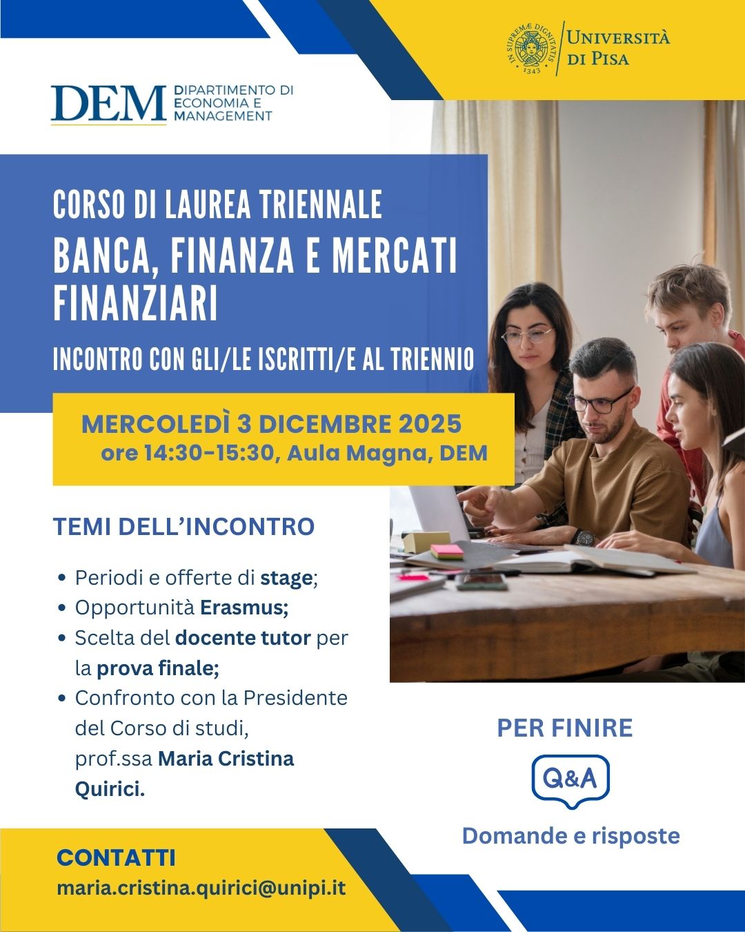 Mercoledì 3 dicembre 2025, dalle 14:30 alle 15:30 in Aula Magna del Dipartimento, si terrà un incontro rivolto a tutte le studentesse e gli studenti del triennio, organizzato dalla Presidente del Corso di studi, prof.ssa Maria Cristina Quirici, per rispondere alle domande e chiarire dubbi sul percorso formativo.